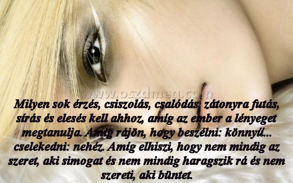 Milyen sok érzés - Milyen sok érzés, csiszolás, csalódás, zátonyra futás, sírás és elesés kell ahhoz, amíg az ember a lényeget megtanulja. Amíg rájön, hogy beszélni: könnyű... cselekedni: nehéz. Amíg elhiszi, hogy nem mindig az szeret, aki simogat és nem mindig haragszik rá és nem szereti, aki büntet.